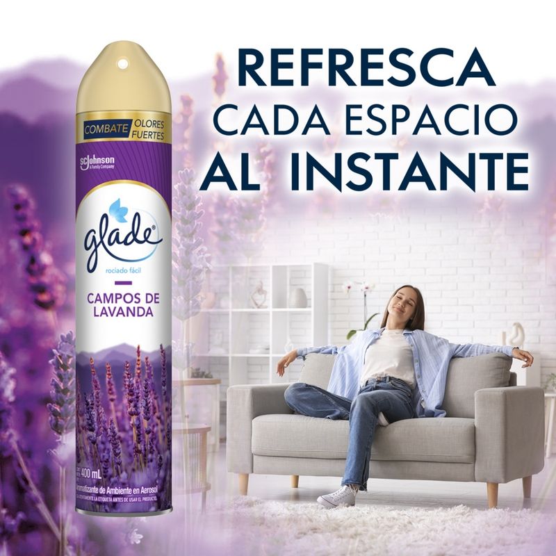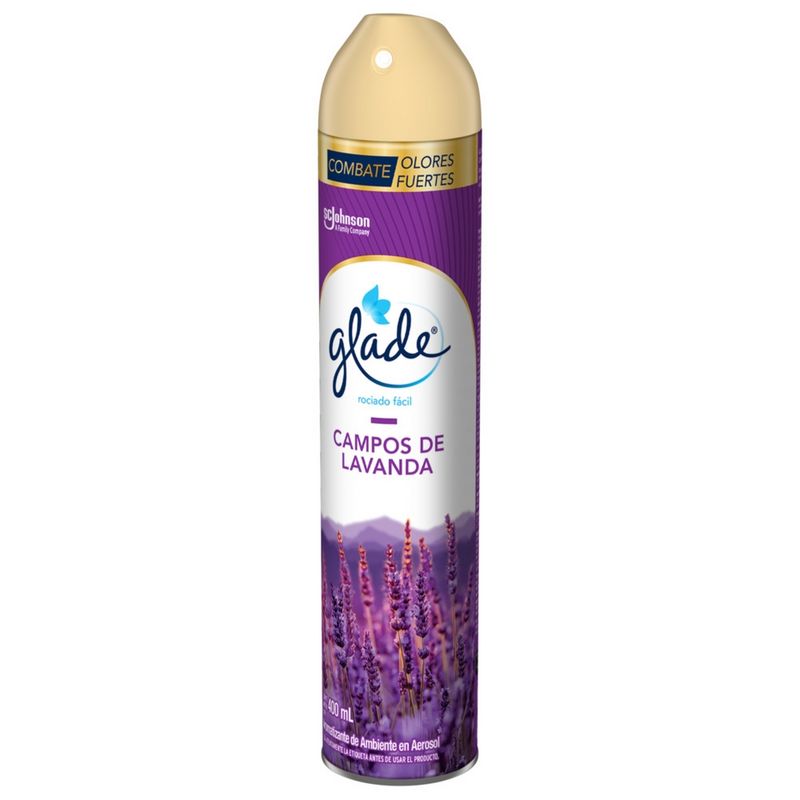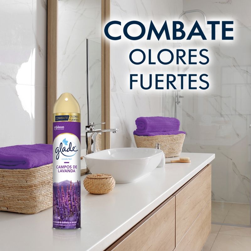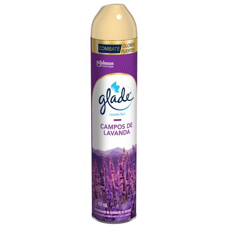 Elimina olores y aromatiza fácilmente tu hogar con Glade aerosol campos de lavanda 400ml. hecho con aceites naturales, da frescura instantanea a tu baño, cocina, habitación o cualquier espacio del hogar.