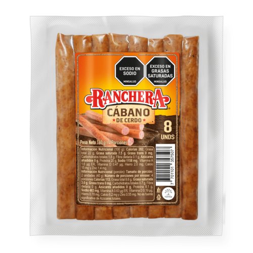 Cábano Ranchera x 160 gramos. 8 unidades de carne de res y cerdo con el toque irresistible del tocino y una cuidadosa selección de especias naturales como pimienta, ajo y paprika.