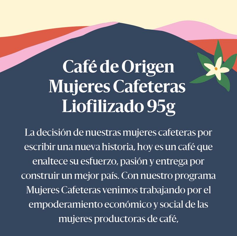 Ahora nuestro café Mujeres Cafeteras está disponible en liofilizado, puedes prepararlo en agua o leche. Con nuestro programa Mujeres Cafeteras venimos trabajando por el empoderamiento económico y social de las mujeres productoras de café, para que a través de la equidad de género logremos un mejor futuro para sus familias, sus comunidades y en general para el campo colombiano.