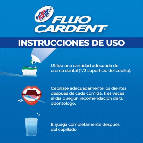 La Crema Dental Fluocardent Triple Acción Max garantiza a tu boca y la de toda tu familia protección anticaries y antisarro, limpieza profunda con una sonrisa más clara, brillante y con aliento fresco y prolongado. Recuerda que es recomendable cepillar tus dientes 3 veces al día después de cada comida. Para obtener mejores resultados incluye en la rutina diaria de limpieza oral, seda y cepillo dental fluocardent.