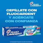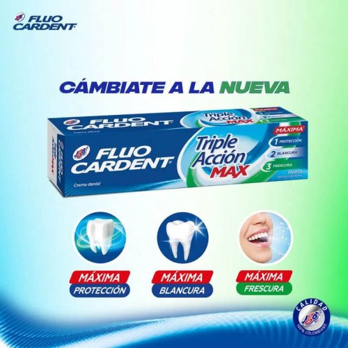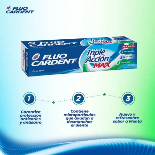 La Crema Dental Fluocardent Triple Acción Max garantiza a tu boca y la de toda tu familia protección anticaries y antisarro, limpieza profunda con una sonrisa más clara, brillante y con aliento fresco y prolongado. Recuerda que es recomendable cepillar tus dientes 3 veces al día después de cada comida. Para obtener mejores resultados incluye en la rutina diaria de limpieza oral, seda y cepillo dental fluocardent.