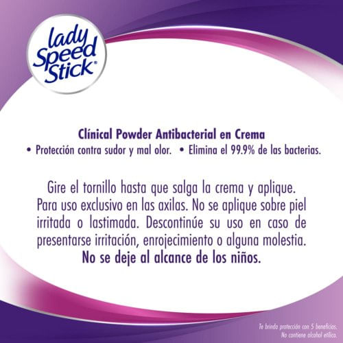 Higiene y Cuidado PersonalCuidado CorporalDesodorantesDesodorante Lady Speed Stick Clínical Powder Antibacterial en Crema 55g