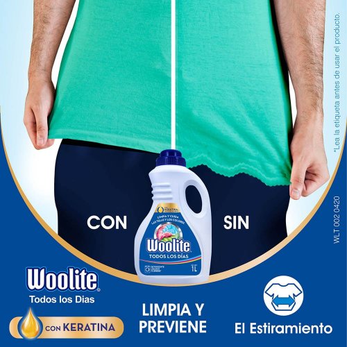 Woolite Todos los Días ahora con Keratina es el detergente líquido para toda tu ropa. No importa si es de color o blanca, Woolite te ayuda a limpiar y prevenir la pérdida de color, el estiramiento y el encogimiento de tus prendas favoritas.