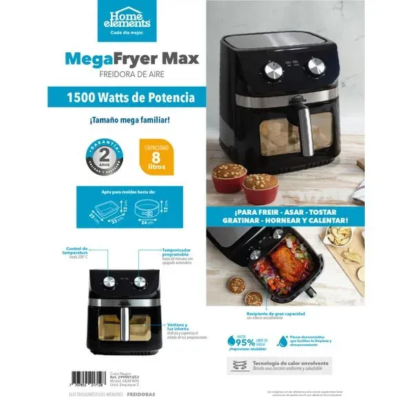 Con la MegaFryer Max de Home Elements podrás freír, asar, tostar, gratinar, hornear y calentar tus comidas favoritas sin usar aceite. Gracias a su gran capacidad de 8 litros y su potencia de 1500 watts, es perfecta para familias numerosas o para quienes disfrutan cocinar en grande. Su ventana con luz interna te permite seguir el proceso sin abrir la freidora, y su tecnología de calor envolvente garantiza una cocción uniforme. Además, cuenta con control de temperatura hasta 200 °C y temporizador programable de hasta 60 minutos. ¡Una freidora versátil, potente y práctica que se convierte en tu mejor aliada en la cocina!