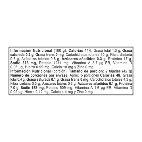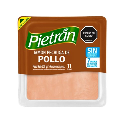 Jamón de pollo sin conservantes. 96% libre de grasa y 25% reducido en sodio. Contiene 11 tajadas (230g) para que disfrutes del placer de cuidarse.