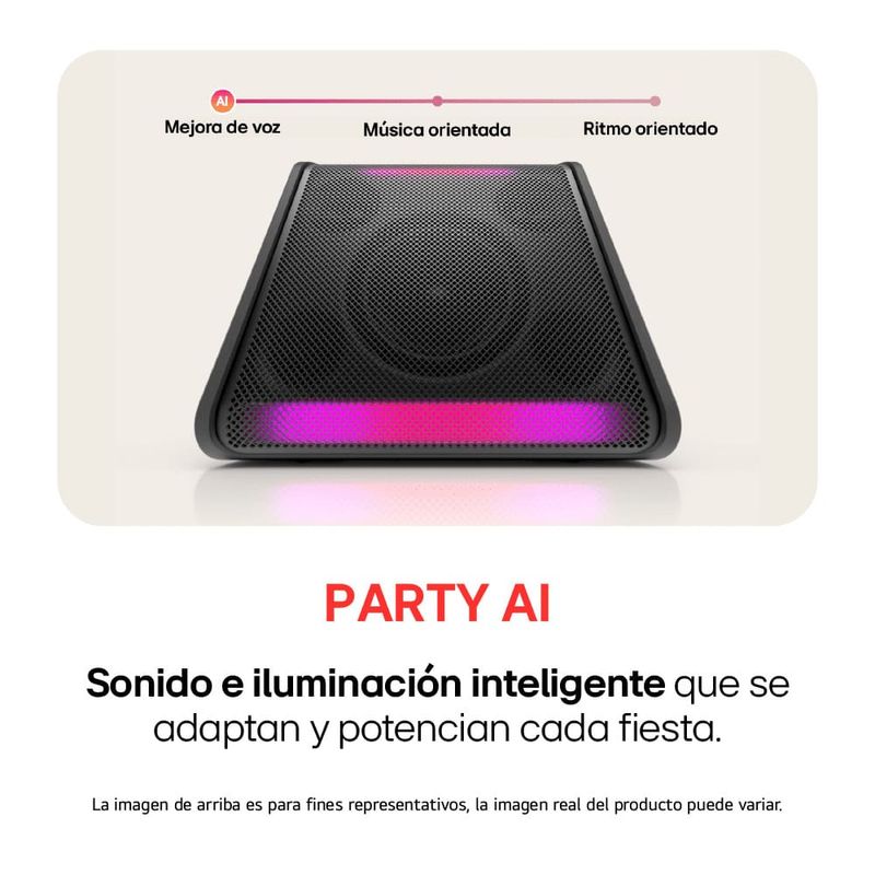 Siente el poder del LG xboom Stage, con 120W de sonido y graves profundos que se ajustan en tiempo real con IA. Disfruta de luces dinámicas que se sincronizan con tu música y conecta múltiples parlantes con Auracast para un sonido envolvente. Su diseño ligero y batería intercambiable lo hacen perfecto para cualquier fiesta.