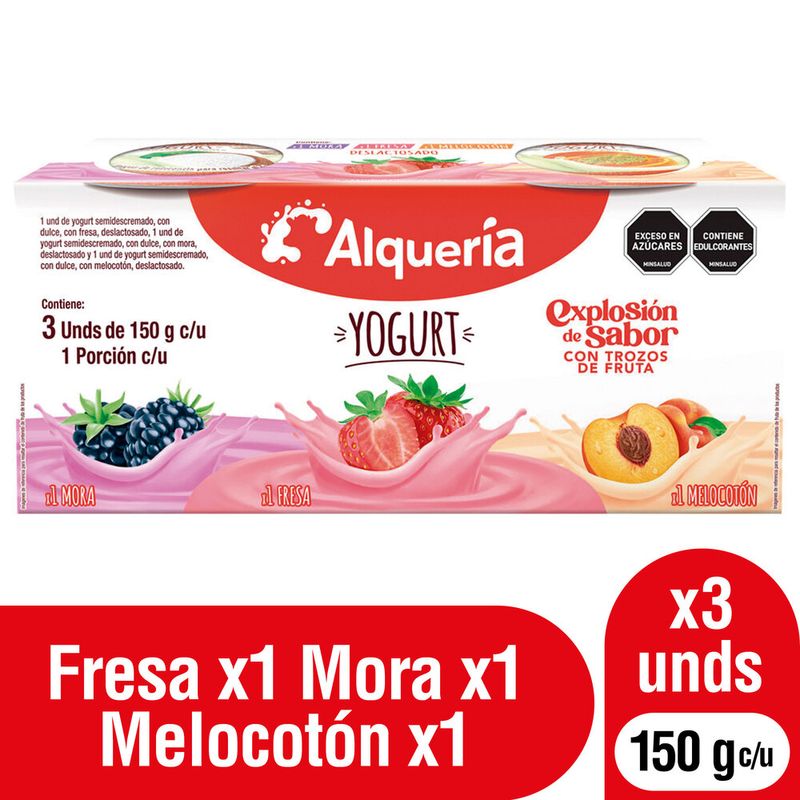 MercadoLácteos Huevos y RefrigeradosYogurt y Bebidas LácteasYogurt Alquería Melocotón Fresa Mora Vaso 3 und x 150 g c/u